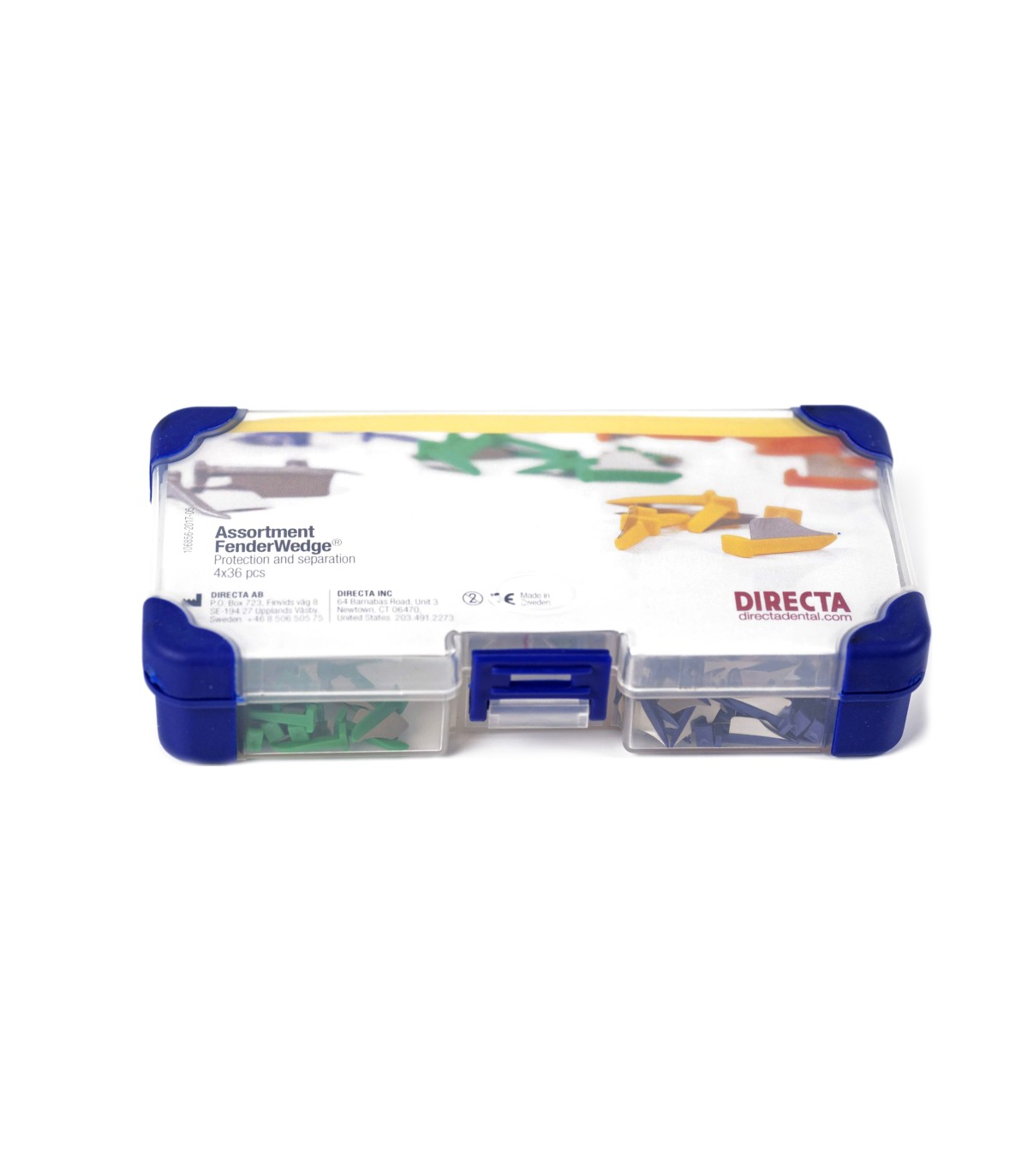فندر وج Directa fenderwedge با ایجاد فاصله میان دندان ها در حین عملیات ترمیمی باعث می شود تا دندان های مجاور آسیب نبینند. آسیب به دندان های مجاور حین عملیات ترمیمی یکی از مشکلات فراگیر میان دندانپزشکان می باشد. طبق پژوهش های انجام شده 70 درصد این آسیب ها حین آماده سازی های کلاس II رخ می دهد. فندروج از این آسیب به دندان مجاور جلوگیری می نماید. فندر وج Directa ترکیبی از استیل و پلاستیک وج است و به کارگیری ماتریکس را بسیار آسان می کند. فندر وج دایرکتا در 4 سایز بسیار کوچک ، کوچک ، متوسط و بزرگ عرضه می شود.